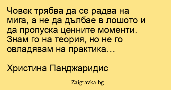 Човек трябва да се радва на мига, а не да дълбае в лошото и да пропуска ценните моменти. Знам го на теория, но не го овладявам на практика…