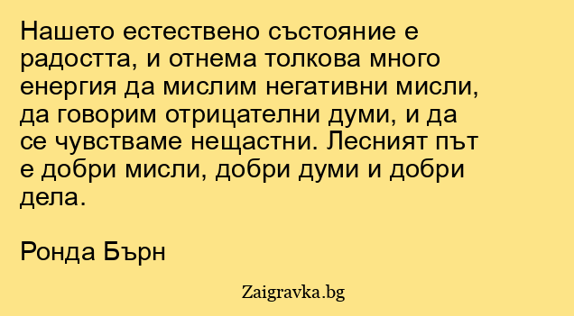 Нашето естествено състояние е радостта, и отнема толкова много енергия да мислим негативни мисли, да говорим отрицателни думи, и да се чувстваме нещастни. Лесният път е добри мисли, добри думи и добри дела.