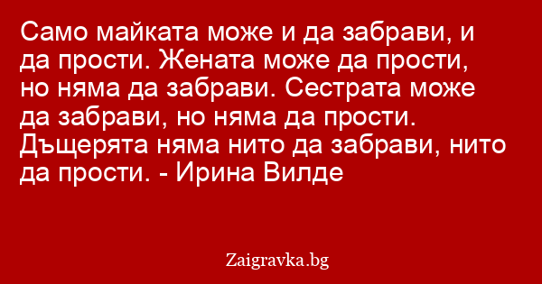 Само майката може и да забрави, и да прости. Жената може да прости, но няма да забрави. Сестрата може да забрави, но няма да прости. Дъщерята няма нито да забрави, нито да прости. - Ирина Вилде