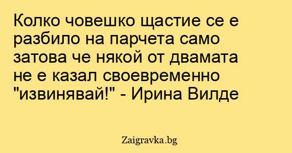 Колко човешко щастие се е разбило на парчета само затова че някой от двамата не е казал своевременно "извинявай!" - Ирина Вилде