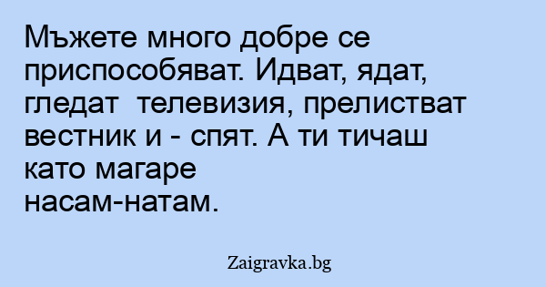 Мъжете много добре се приспособяват. Идват, ядат, гледат телевизия, прелистват вестник и - спят. А ти тичаш като магаре