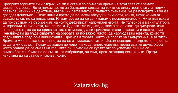 Вече нямам време да понасям абсурдни личности, които, независимо от възрастта си, не са пораснали. Нямам време да се занимавам с посредствености. Нито пък искам да присъствам на събирания, на които дефилират напомпани его-та.