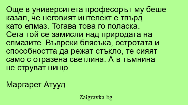 Още в университета професорът му беше казал, че неговият интелект е твърд като елмаз. Тогава това го поласка. Сега той се замисли над природата на елмазите. Въпреки блясъка, остротата и способността да режат стъкло, те сияят само с отразена светлина. А в тъмнина не струват нищо.