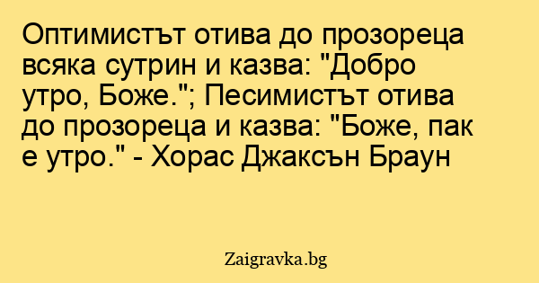 Оптимистът отива до прозореца всяка сутрин и казва: "Добро утро, Боже."; Песимистът отива до прозореца и казва: "Боже, пак е утро." - Хорас Джаксън Браун