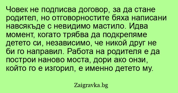Човек не подписва договор, за да стане родител, но отговорностите бяха написани навсякъде с невидимо мастило. Идва момент, когато трябва да подкрепяме детето си, независимо, че никой друг не би го направил. Работа на родителя е да построи наново моста, дори ако онзи, който го е изгорил, е именно детето му.