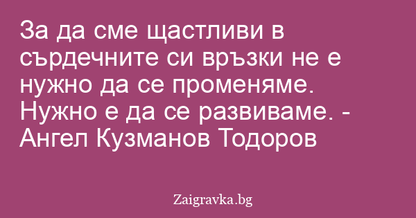 За да сме щастливи в сърдечните си връзки не е нужно да се променяме. Нужно е да се развиваме. - Ангел Кузманов Тодоров