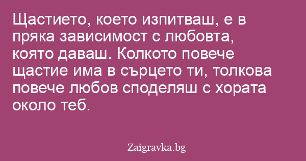 Щастието, което изпитваш, е в пряка зависимост с любовта, която даваш. Колкото повече щастие има в сърцето ти, толкова повече любов споделяш с хората около теб.