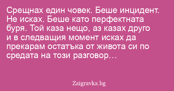 Срещнах един човек. Беше инцидент. Не исках. Беше като перфектната буря. Той каза нещо, аз казах друго и в следващия момент исках да прекарам остатъка от живота си по средата на този разговор…