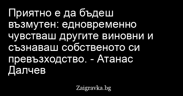 Приятно е да бъдеш възмутен: едновременно чувстваш другите виновни и съзнаваш собственото си превъзходство. - Атанас Далчев