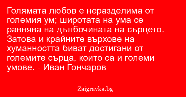 Голямата любов е неразделима от големия ум; широтата на ума се равнява на дълбочината на сърцето. Затова и крайните върхове на хуманността биват достигани от големите сърца, които са и големи умове. - Иван Гончаров