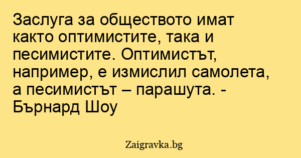 Заслуга за обществото имат както оптимистите, така и песимистите. Оптимистът, например, е измислил самолета, а песимистът – парашута. - Бърнард Шоу