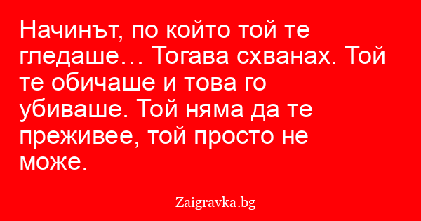 Начинът, по който той те гледаше… Тогава схванах. Той те обичаше и това го убиваше. Той няма да те преживее, той просто не може.