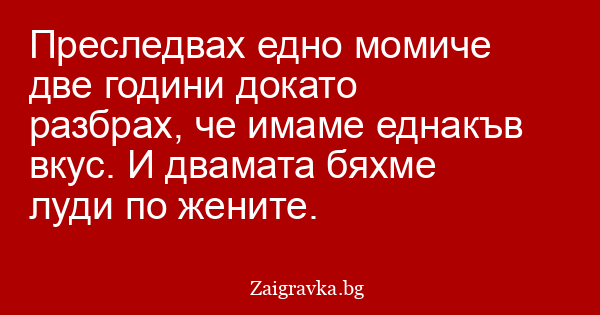 Преследвах едно момиче две години докато разбрах, че имаме еднакъв вкус. И двамата бяхме луди по жените.