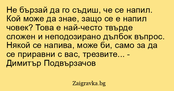 Не бързай да го съдиш, че се напил. Кой може да знае, защо се е напил човек? Това е най-често твърде сложен и неподозирано дълбок въпрос. Някой се напива, може би, само за да се приравни с вас, трезвите... - Димитър Подвързачов