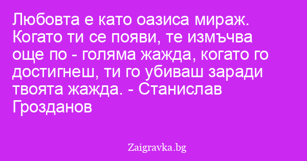 Любовта е като оазиса мираж. Когато ти се появи, те измъчва още по - голяма жажда, когато го достигнеш, ти го убиваш заради твоята жажда. - Станислав Грозданов