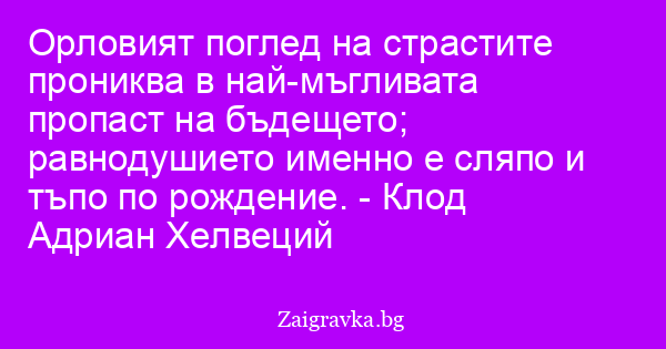 Орловият поглед на страстите прониква в най-мъгливата пропаст на бъдещето; равнодушието именно е сляпо и тъпо по рождение. - Клод Адриан Хелвеций