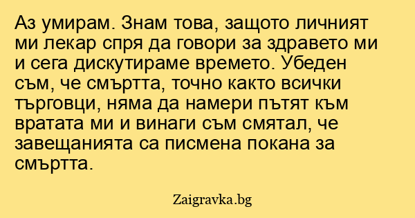 Аз умирам. Знам това, защото личният ми лекар спря да говори за здравето ми и сега дискутираме времето. Убеден съм, че смъртта, точно както всички търговци, няма да намери пътят към вратата ми и винаги съм смятал, че завещанията са писмена покана за смъртта.
