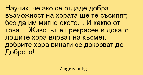 Научих, че ако се отдаде добра възможност на хората ще те съсипят, без да им мигне окото… И какво от това… Животът е прекрасен и докато лошите хора вярват на късмет, добрите хора винаги се докосват до Доброто!