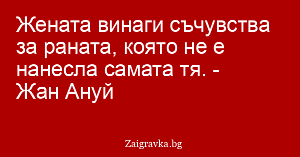 Жената винаги съчувства за раната, която не е нанесла самата тя. - Жан Ануй