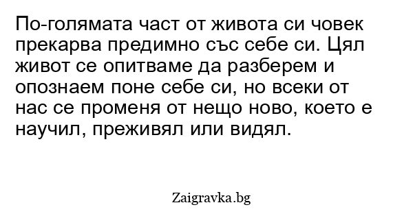 По-голямата част от живота си човек прекарва предимно със себе си. Цял живот се опитваме да разберем и опознаем поне себе си, но всеки от нас се променя от нещо ново, което е научил, преживял или видял.