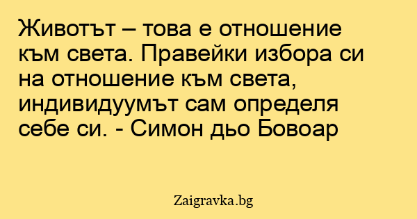 Животът – това е отношение към света. Правейки избора си на отношение към света, индивидуумът сам определя себе си. - Симон дьо Бовоар