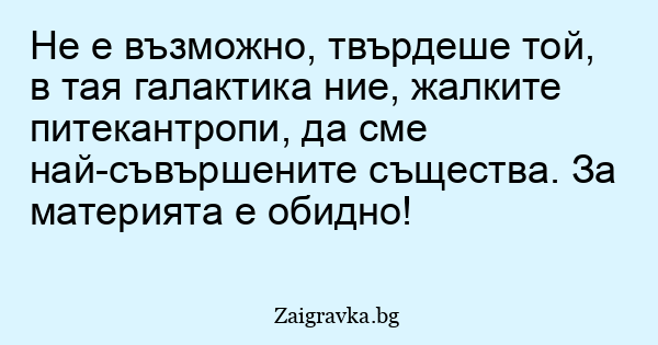 Не е възможно, твърдеше той, в тая галактика ние, жалките питекантропи, да сме най-съвършените същества. За материята е обидно!