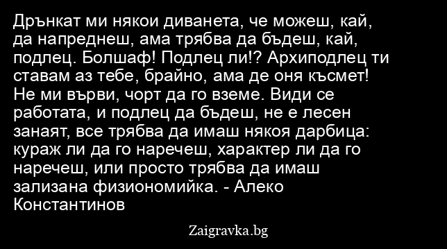 Дрънкат ми някои диванета, че можеш, кай, да напреднеш, ама трябва да бъдеш, кай, подлец. Болшаф! Подлец ли!? Архиподлец ти ставам аз тебе, брайно, ама де оня късмет! Не ми върви, чорт да го вземе. Види се работата, и подлец да бъдеш, не е лесен занаят, все трябва да имаш някоя дарбица: кураж ли да го наречеш, характер ли да го наречеш, или просто трябва да имаш зализана физиономийка. - Алеко Константинов