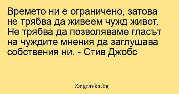 Времето ни е ограничено, затова не трябва да живеем чужд живот. Не трябва да позволяваме гласът на чуждите мнения да заглушава собствения ни. - Стив Джобс
