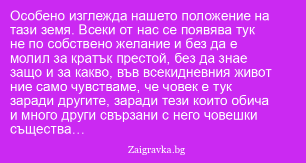 Особено изглежда нашето положение на тази земя. Всеки от нас се появява тук не по собствено желание и без да е молил за кратък престой, без да знае защо и за какво, във всекидневния живот ние само чувстваме, че човек е тук заради другите, заради тези които обича и много други свързани с него човешки същества…