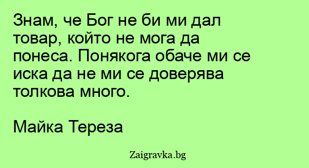Знам, че Бог не би ми дал товар, който не мога да понеса. Понякога обаче ми се иска да не ми се доверява толкова много.