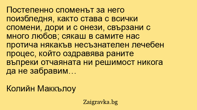Постепенно споменът за него поизбледня, както става с всички спомени, дори и с онези, свързани с много любов; сякаш в самите нас протича някакъв несъзнателен лечебен процес, който оздравява раните въпреки отчаяната ни решимост никога да не забравим…