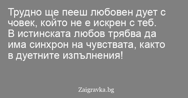 Трудно ще пееш любовен дует с човек, който не е искрен с теб. В истинската любов трябва да има синхрон на чувствата, както в дуетните изпълнения!