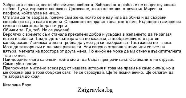 Препрочитам мислено всеки ред от нашата история и това ме прави не само силна, но и ме обозначава в този объркан свят. Не се страхувай. Ще те помня вечно. Ще отлагам да те забравя до края.