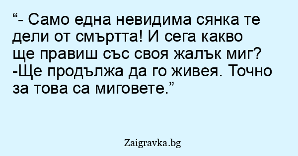 “- Само една невидима сянка те дели от смъртта! И сега какво ще правиш със своя жалък миг? -Ще продължа да го живея. Точно за това са миговете.”