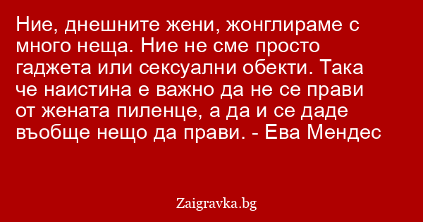 Ние, днешните жени, жонглираме с много неща. Ние не сме просто гаджета или сексуални обекти. Така че наистина е важно да не се прави от жената пиленце, а да и се даде въобще нещо да прави. - Ева Мендес