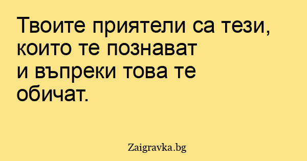 Заигравка » Цитати » Приятелство » Твоите приятели са тези Цитати за приятелството ВраговеВремеДоброДругиДушатаЖенитеЖивотаЖивотниЗлоИзточниИстинатаКрасотаЛичностЛъжатаЛюбовМечтитеМъжетеМъкаНадеждаНастроениеПариПриятелствоРаботаСватбаСвободаСексСтрахСъветСъдбаУсмивкитеУспехУтехаХораЦелувкитеЩастие Твоите приятели са тези, които те познават и въпреки това те обичат. « Предишна Следваща » Подобни цитати От двама добри приятели и мечката бяга. Добавен преди 11 години Това що се върши с приятели, с пари не може да се свърши. Добавен преди 11 години Добре е човек да има и в пъкала приятели. Добавен преди 11 години Добър приятел с пари не се купува. Добавен преди 11 години Роднини се търпят, а приятели се избират. Добавен преди 11 години