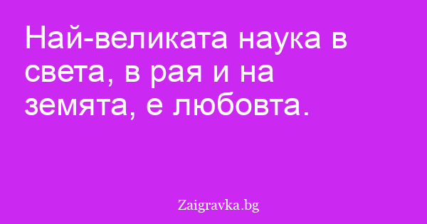 Заигравка » Цитати » Любов » Най-великата наука в Цитати за любовта ВраговеВремеДоброДругиДушатаЖенитеЖивотаЖивотниЗлоИзточниИстинатаКрасотаЛичностЛъжатаЛюбовМечтитеМъжетеМъкаНадеждаНастроениеПариПриятелствоРаботаСватбаСвободаСексСтрахСъветСъдбаУсмивкитеУспехУтехаХораЦелувкитеЩастие Най-великата наука в света, в рая и на земята, е любовта. « Предишна Следваща » Подобни цитати Когато мъж подарява цветя на жена без причина, всъщност причина има. Добавен преди 11 години Няма разлика между глупав и умен мъж, когато е влюбен. Добавен преди 11 години Любовта е дупка в сърцето. Добавен преди 11 години Любовта живее не само от целувките, но и от много компромиси. Добавен преди 11 години Любовта започва с усмивка, живее от целувките и умира със сълзите. Добавен преди 11 години