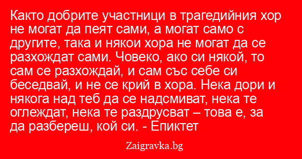 Както добрите участници в трагедийния хор не могат да пеят сами, а могат само с другите, така и някои хора не могат да се разхождат сами. Човеко, ако си някой, то сам се разхождай, и сам със себе си беседвай, и не се крий в хора. Нека дори и някога над теб да се надсмиват, нека те оглеждат, нека те раздрусват – това е, за да разбереш, кой си. - Епиктет