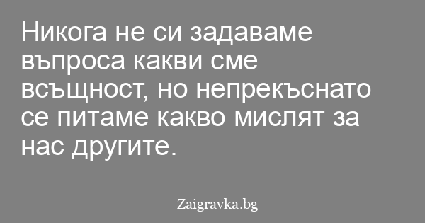 Заигравка » Цитати » Душата » Никога не си задаваме Цитати за душата ВраговеВремеДоброДругиДушатаЖенитеЖивотаЖивотниЗлоИзточниИстинатаКрасотаЛичностЛъжатаЛюбовМечтитеМъжетеМъкаНадеждаНастроениеПариПриятелствоРаботаСватбаСвободаСексСтрахСъветСъдбаУсмивкитеУспехУтехаХораЦелувкитеЩастие Никога не си задаваме въпроса какви сме всъщност, но непрекъснато се питаме какво мислят за нас другите. « Предишна Следваща » Подобни цитати Човек трябва да се стреми да му завиждат колкото се може по-малко. Добавен преди 11 години Човек може да стане свободен само чрез свободата на другите. Добавен преди 11 години Най-голямото богатство, това са човешките взаимоотношения. Добавен преди 11 години Има само едно истинско богатство, и то е общуването между хората. Добавен преди 11 години Ако искам да видя пеперуди, трябва да изтърпя две-три гъсеници. Добавен преди 11 години
