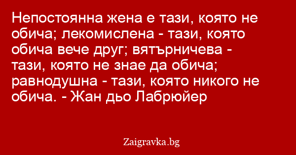 Непостоянна жена е тази, която не обича; лекомислена - тази, която обича вече друг; вятърничева - тази, която не знае да обича; равнодушна - тази, която никого не обича. - Жан дьо Лабрюйер