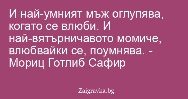 И най-умният мъж оглупява, когато се влюби. И най-вятърничавото момиче, влюбвайки се, поумнява. - Мориц Готлиб Сафир