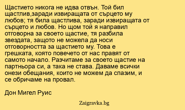 Щастието никога не идва отвън. Той бил щастлив,заради извиращата от сърцето му любов; тя била щастлива, заради извиращата от сърцето и любов. Но щом той я направил отговорна за своето щастие, тя разбила звездата, защото не можела да носи отговорността за щастието му. Това е грешката, която повечето от нас правят от самото начало. Разчитаме за своето щастие на партньора си, а така не става. Даваме всички онези обещания, които не можем да спазим, и се обричаме на провал.