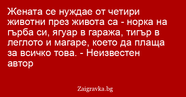 Жената се нуждае от четири животни през живота са - норка на гърба си, ягуар в гаража, тигър в леглото и магаре, което да плаща за всичко това. - Неизвестен автор