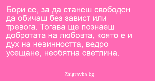 Бори се, за да станеш свободен да обичаш без завист или тревога. Тогава ще познаеш добротата на любовта, която е и дух на невинността, ведро усещане, необятна светлина.