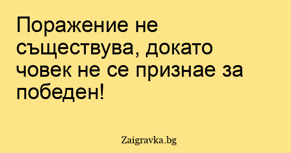 Заигравка » Цитати » Живота » Поражение не съществува Цитати за живота ВраговеВремеДоброДругиДушатаЖенитеЖивотаЖивотниЗлоИзточниИстинатаКрасотаЛичностЛъжатаЛюбовМечтитеМъжетеМъкаНадеждаНастроениеПариПриятелствоРаботаСватбаСвободаСексСтрахСъветСъдбаУсмивкитеУспехУтехаХораЦелувкитеЩастие Поражение не съществува, докато човек не се признае за победен! « Предишна Следваща » Подобни цитати В истината има повече красота, дори когато красотата е отвратителна. Добавен преди 11 години Отмъщението не връща загубеното. Добавен преди 11 години Ревността е страх от превъзходството на другия. Добавен преди 11 години Животът (Съдбата) е това, което се случва докато кроим други планове. Добавен преди 11 години Дай му на човек да избира, па му гледай сеира. Добавен преди 11 години