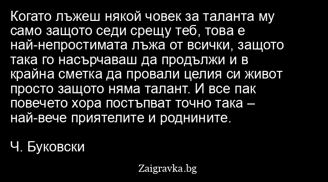 Когато лъжеш някой човек за таланта му само защото седи срещу теб, това е най-непростимата лъжа от всички, защото така го насърчаваш да продължи и в крайна сметка да провали целия си живот просто защото няма талант. И все пак повечето хора постъпват точно така – най-вече приятелите и роднините.