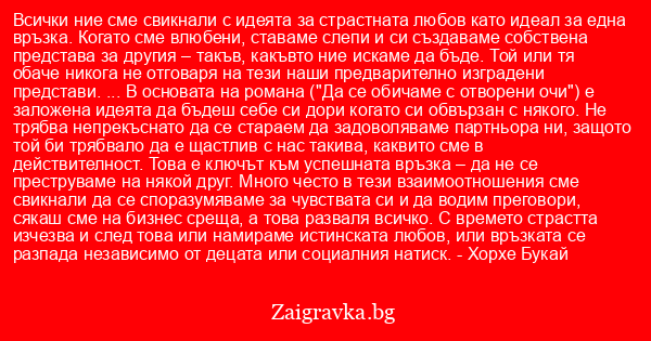 Всички ние сме свикнали с идеята за страстната любов като идеал за една връзка. Когато сме влюбени, ставаме слепи и си създаваме собствена представа за другия – такъв, какъвто ние искаме да бъде. Той или тя обаче никога не отговаря на тези наши предварително изградени представи. ... В основата на романа ("Да се обичаме с отворени очи") е заложена идеята да бъдеш себе си дори когато си обвързан с някого. Не трябва непрекъснато да се стараем да задоволяваме партньора ни, защото той би трябвало да е щастлив с нас такива, каквито сме в действителност. Това е ключът към успешната връзка – да не се преструваме на някой друг. Много често в тези взаимоотношения сме свикнали да се споразумяваме за чувствата си и да водим преговори, сякаш сме на бизнес среща, а това разваля всичко. С времето страстта изчезва и след това или намираме истинската любов, или връзката се разпада независимо от децата или социалния натиск. - Хорхе Букай