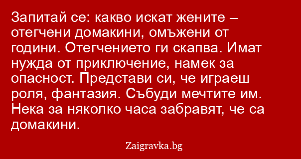 Запитай се: какво искат жените – отегчени домакини, омъжени от години. Отегчението ги скапва. Имат нужда от приключение, намек за опасност. Представи си, че играеш роля, фантазия. Събуди мечтите им. Нека за няколко часа забравят, че са домакини.