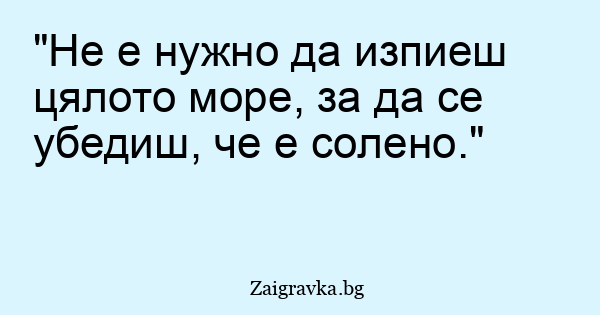 Заигравка » Цитати » Други » Не е нужно да изпиеш Разни мъдрости, мисли и цитати ВраговеВремеДоброДругиДушатаЖенитеЖивотаЖивотниЗлоИзточниИстинатаКрасотаЛичностЛъжатаЛюбовМечтитеМъжетеМъкаНадеждаНастроениеПариПриятелствоРаботаСватбаСвободаСексСтрахСъветСъдбаУсмивкитеУспехУтехаХораЦелувкитеЩастие "Не е нужно да изпиеш цялото море, за да се убедиш, че е солено." « Предишна Следваща » Подобни цитати Колкото повече, толкова повече! Добавен преди 11 години За глухия няма гръм, за слепия няма светкавица. Добавен преди 11 години Смелост е да живееш всеки ден, сякаш е последен. Добавен преди 11 години Да правим каквото трябва, да се случва каквото ще! Добавен преди 11 години Не е глупак този който говори глупости, а този който ги слуша. Добавен преди 11 години