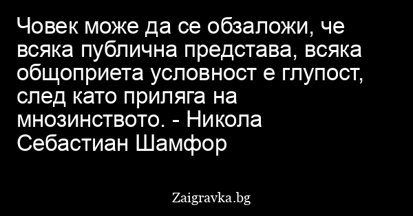 Човек може да се обзаложи, че всяка публична представа, всяка общоприета условност е глупост, след като приляга на мнозинството. - Никола Себастиан Шамфор